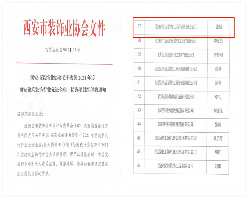 經西安市裝飾業專家評審委員會評審:西安翔遠裝飾工程有限責任公司被評為2021年度建筑裝飾行業優秀企業。